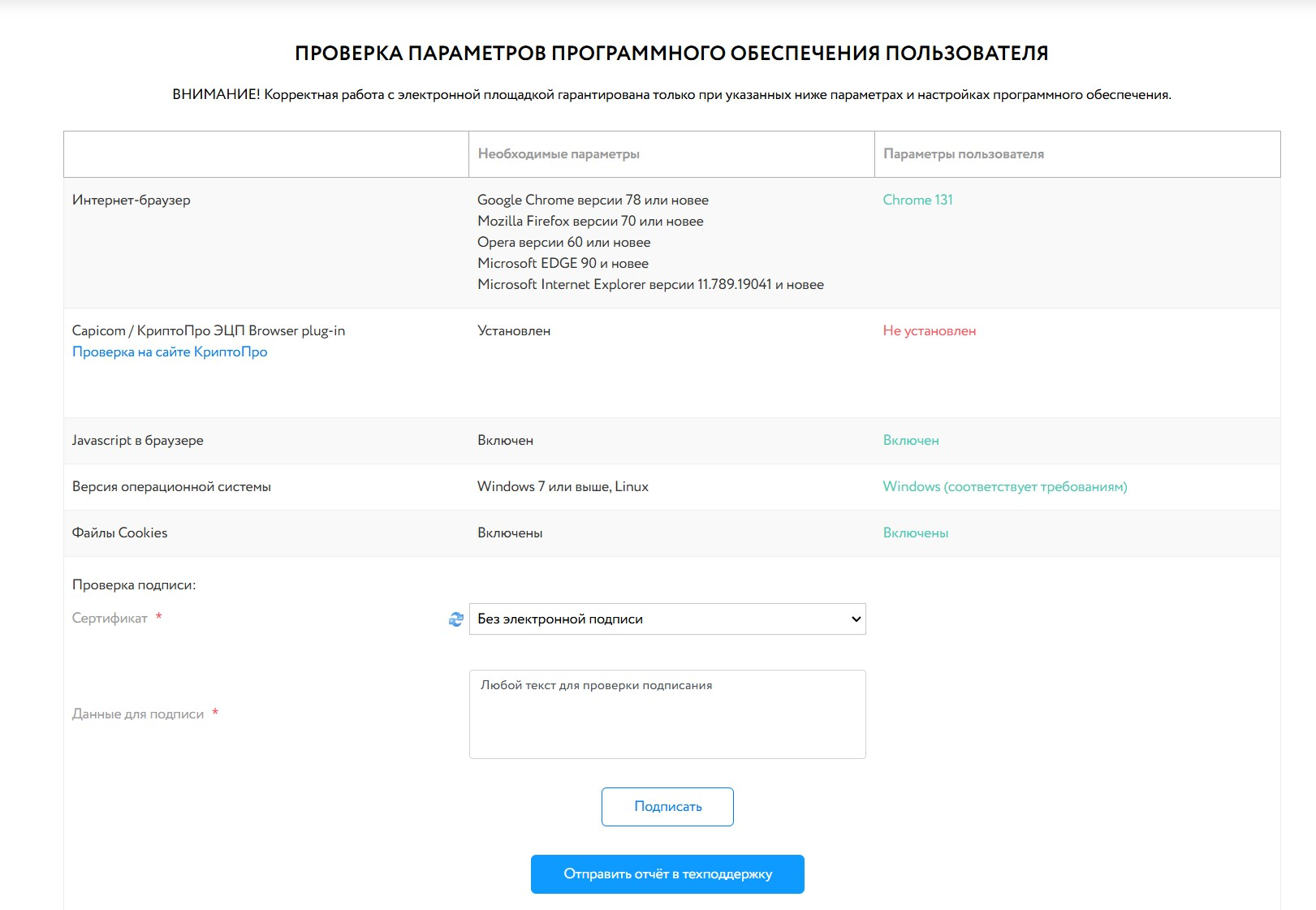 Параметры подробно прописаны в разделе «Услуги» — «Проверка настроек рабочего места». В таблице особое внимание обратите на действие лицензии плагина и на статус проверки ЭП.
