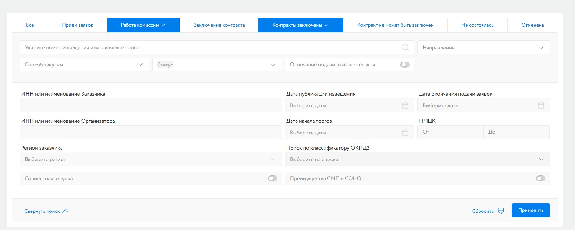 Также есть возможность конкретизировать условия. Например, указать способ и направление, регион и текущий этап.