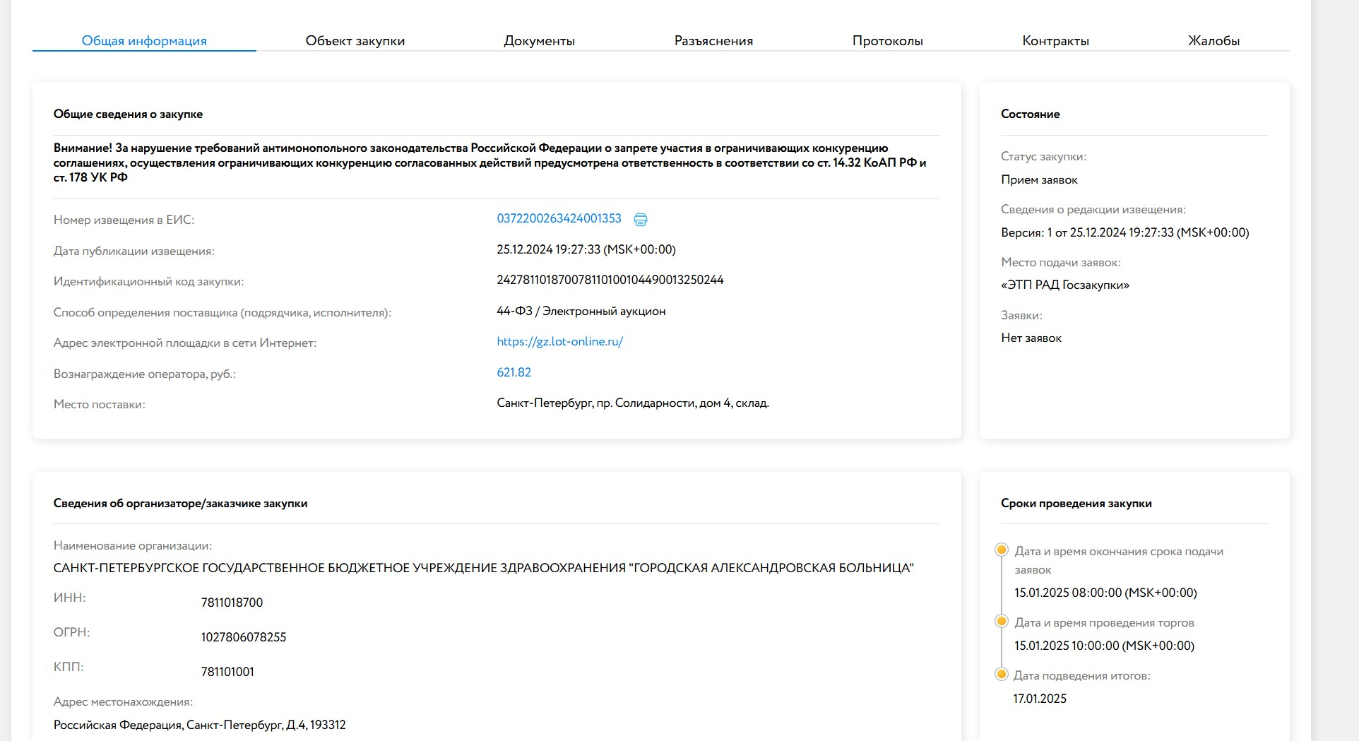 Пример: больница объявляет конкурс для поставки хлеба в столовую.
