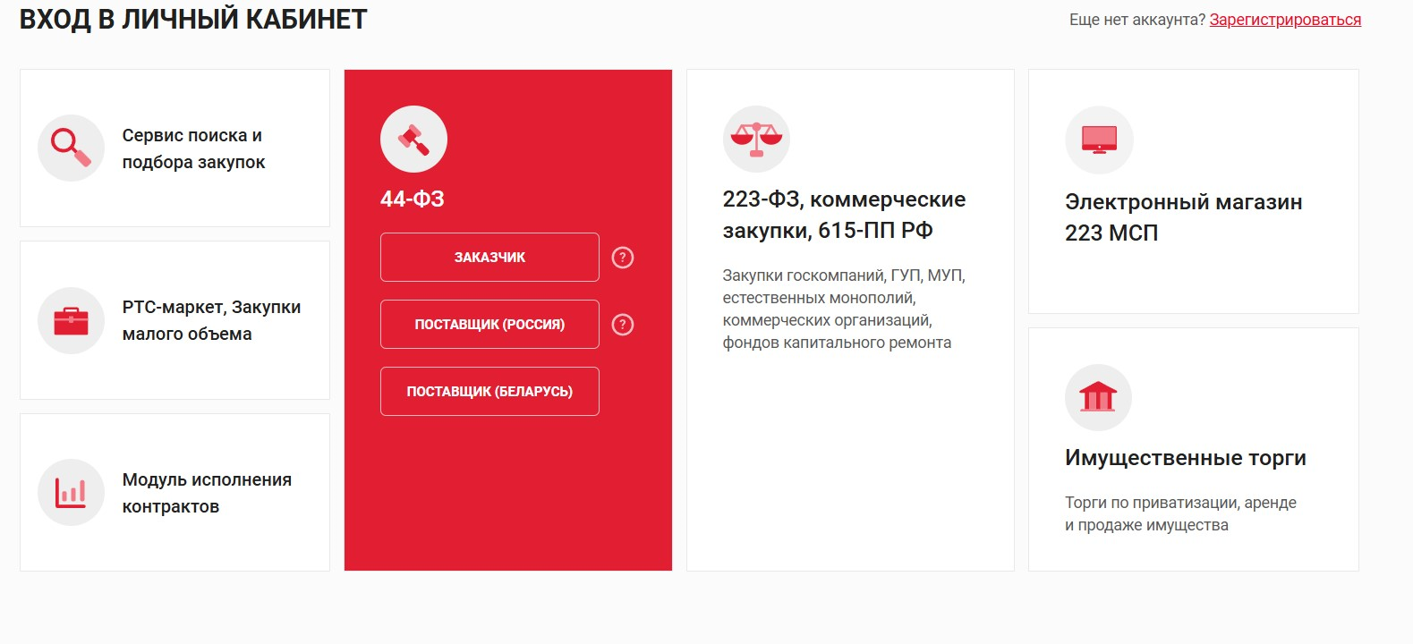 Для участия в операциях вне контекста №223-ФЗ понадобится отдельная аккредитация. Вы проходите её по клику на секцию, которая подходит для вашего случая.