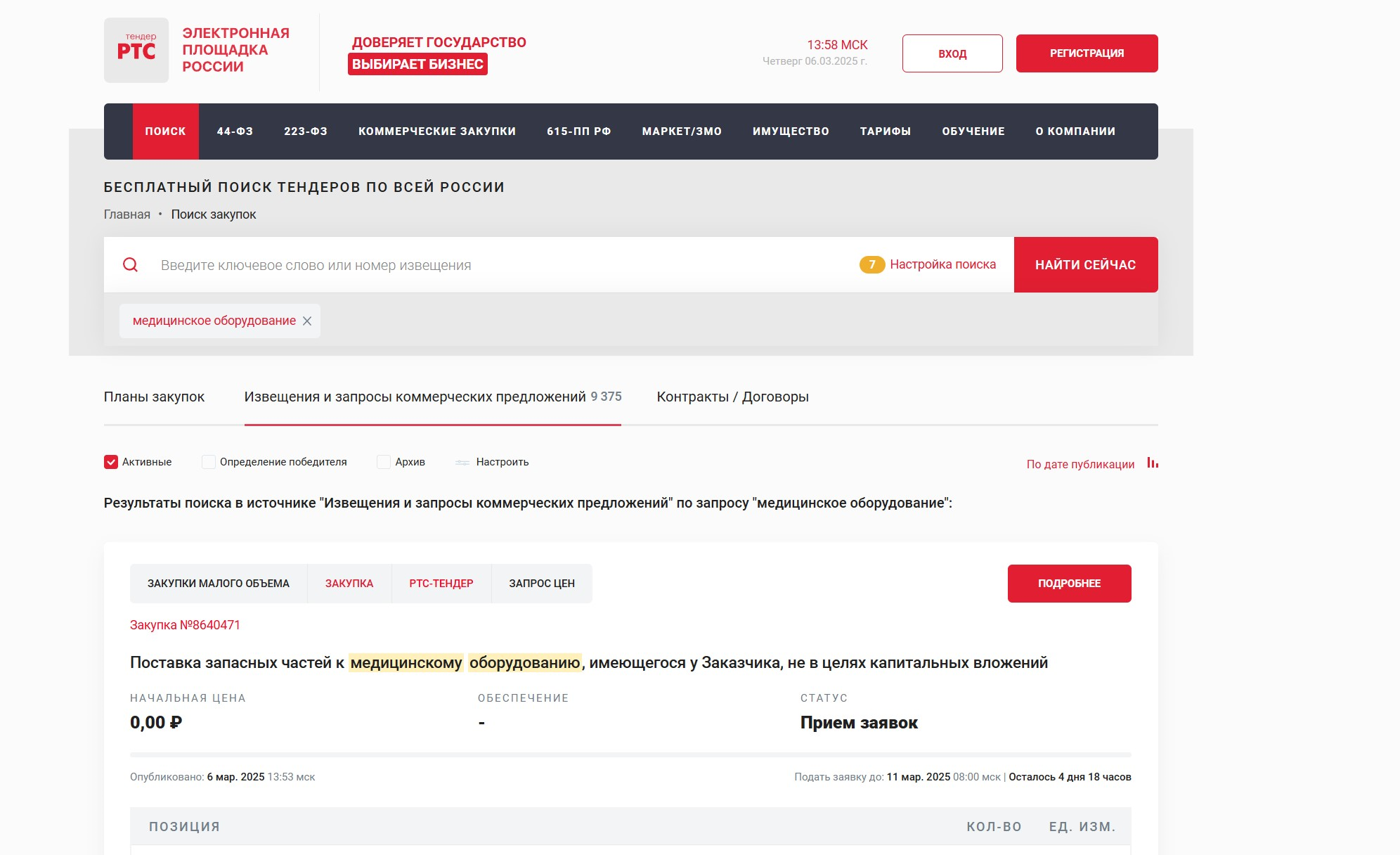 Чтобы найти нужный лот, пользователю достаточно перейти в раздел и ввести ключевые слова в поисковую строку. К примеру, можно указать «медицинское оборудование» или «канцелярия».