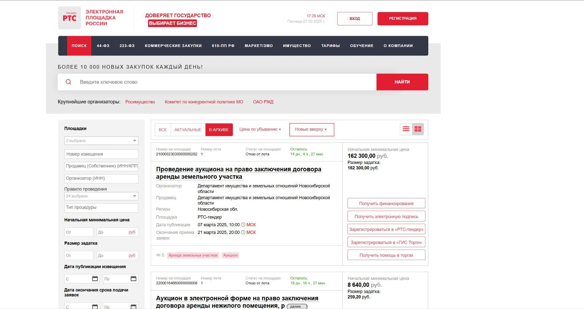 Перечень доступных лотов можно просмотреть и без прохождения регистрации. Он находится в открытом доступе в соответствующей рубрике на главной странице.