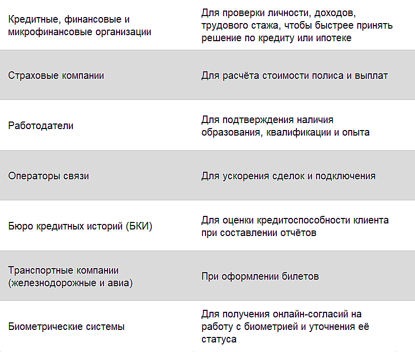 Целью этого проекта является упрощение обмена информацией и получения государственных услуг. Пользователю не обязательно лично приходить в отделения банков и сначала собирать, а потом подавать бумажные справки. Бизнес допускается только с согласия россиянина и только к тем материалам, которые действительно необходимы.