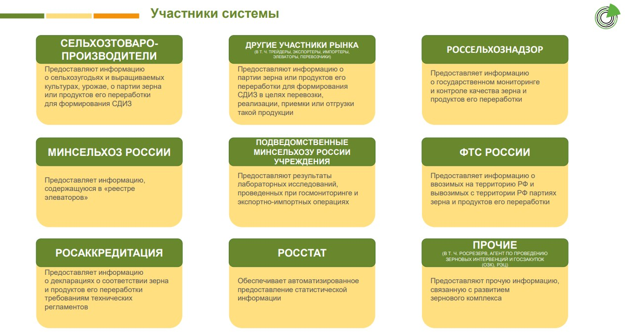 Не считая госорганов, в системе работают российские сельхозпроизводители, импортёры, элеваторы, переработчики зерна, участники оптового и розничного рынка (трейдеры), экспортёры. Мониторинг начинается со сбора урожая или импорта и заканчивается его продажей, экспортом или утилизацией. Обязанность регистрации в госсистеме зависит, прежде всего, от вида зерна (продукта его переработки) и назначения.