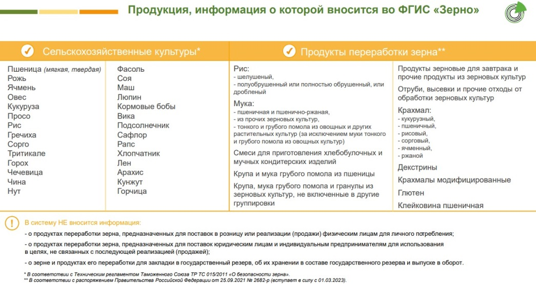 Полный перечень сведений, которые подлежат направлению во ФГИС «Зерно», указан в постановлении Правительства №1722. Зерновые культуры, подлежащие контролю, определяет Техрегламент Таможенного союза ТР ТС 015/2011, а продукты переработки зерна — распоряжение Правительства № 2682-р от 25.09.2021.
