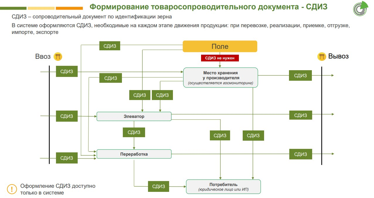 Основной документ в процессе оборота зерна и продуктов его переработки — СДИЗ. Его оформляют на всех этапах движения продукции, и такие этапы определяют вид этого документа: приёмка, отгрузка, транспортировка, реализация, экспорт, импорт.