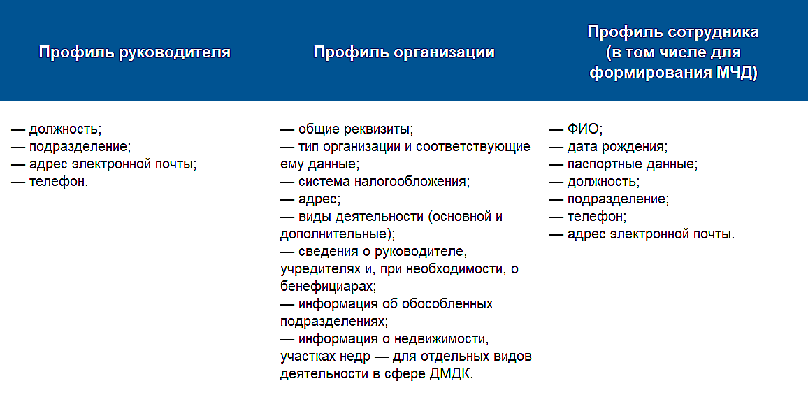 В процессе регистрации руководитель организации (ИП) заполняет свой профиль, профиль организации и профили сотрудников, если это нужно. Для этого необходимы определённые документы и сведения, которые мы привели в таблице.