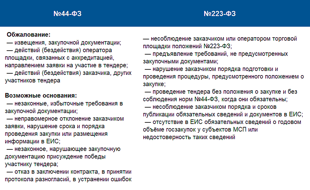 Основания для жалобы зависят от нормативного регулирования конкретной госзакупки. Перечисляем их в таблице: