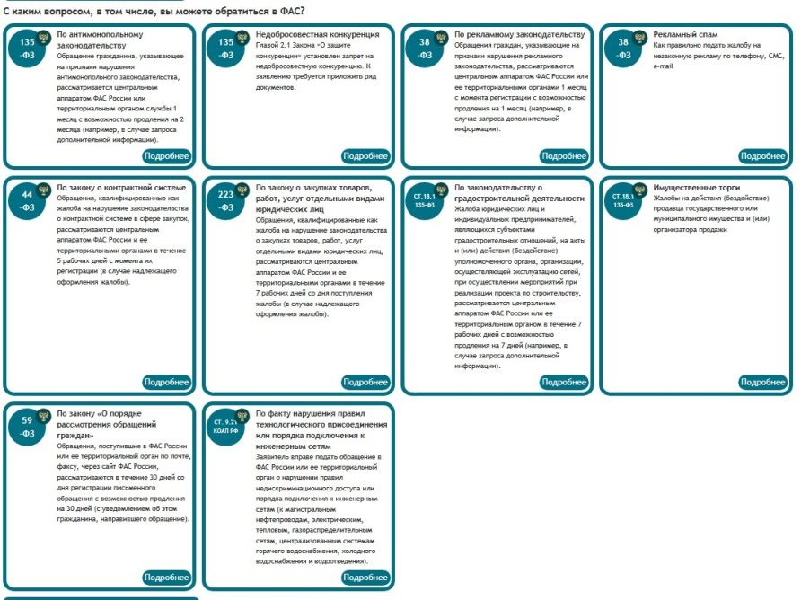 В случае недобросовестной конкуренции, других отхождений от требований антимонопольного законодательства, процедурные аспекты направления и рассмотрения обращений регулирует Федеральный закон №135-ФЗ от 26.07.2006 г. «О защите конкуренции». Жалоба в ФАС по №223 ФЗ рассматривается ведомством в соответствии со ст. 18.1 №135-ФЗ.