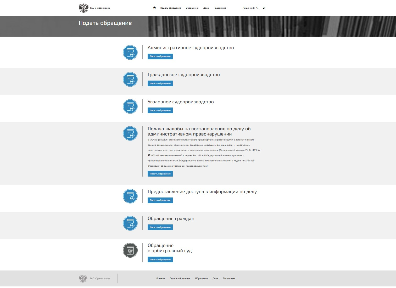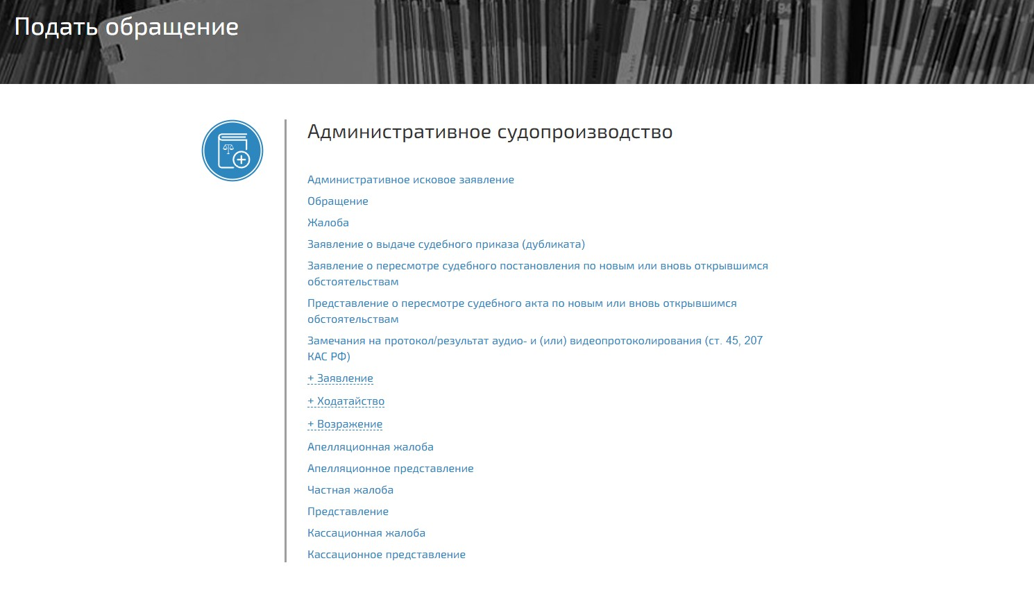 Если вы начинаете процесс, например, подаёте иск, переходите к разделу «Заявления и жалобы». Там же формируются апелляционные, кассационные и надзорные жалобы и подаются материалы для пересмотра дела по новым обстоятельствам.