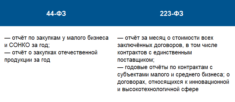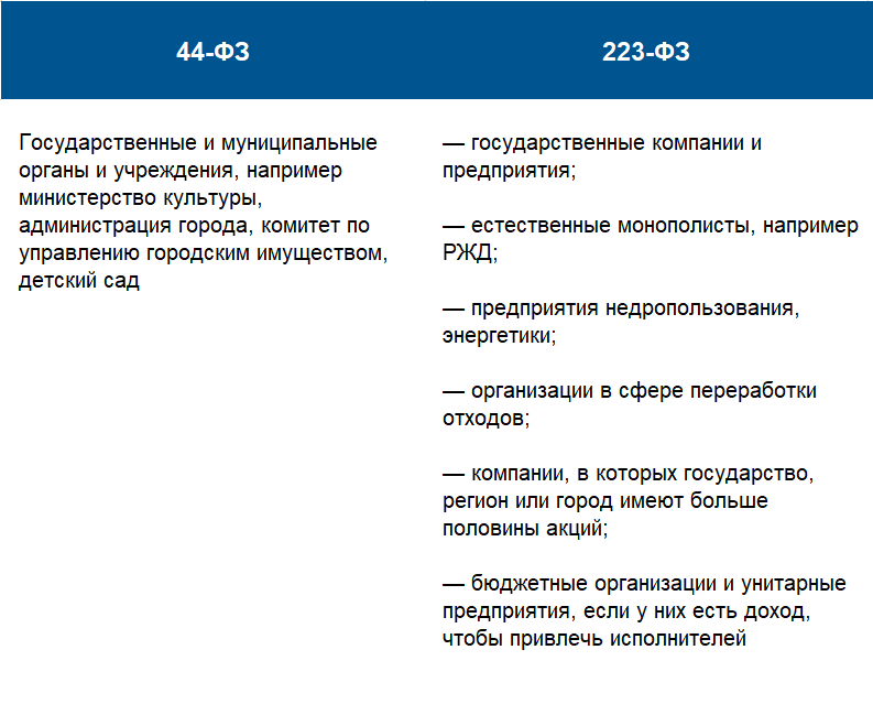 Федеральный закон №44-ФЗ регламентирует закупки органов власти из средств госбюджета, №223-ФЗ — отдельных юридических лиц из своих доходов.