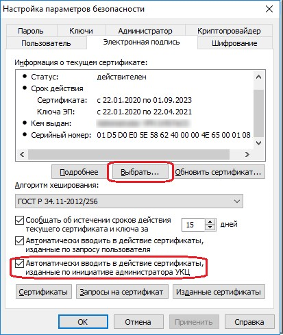 Для автоматического ввода в действие сертификатов, изданных в УЦ, в программе ViPNet Client (Monitor/Деловая почта) во вкладке «Подпись» (окно открывается через «Инструменты» => «Настройка параметров безопасности» => вкладка «Подпись») должна быть установлена галка напротив «Автоматически вводить в действие сертификаты, изданные по инициативе администратора УКЦ» (см. рисунок). Если обновления к вам поступили до того момента, как вы поставили галку, то задать новый сертификат можно через кнопку «Выбрать…» в том же окне.