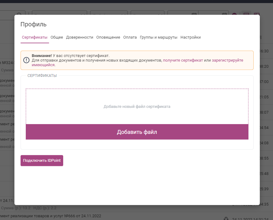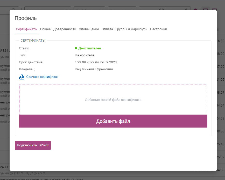 - На вкладке «Сертификаты» вашего профиля нажмите кнопку «Добавить файл» и укажите путь к сертификату, сохранённому на компьютере, либо перетащите файл сертификата в специальную область над кнопкой.