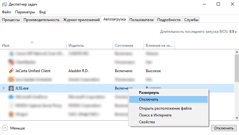 В ОС Windows 10 откройте диспетчер задач, выберите вкладку «Автозагрузка», найдите приложение JLSS.exe, выделите его правой кнопкой мыши и нажмите кнопку «Отключить».