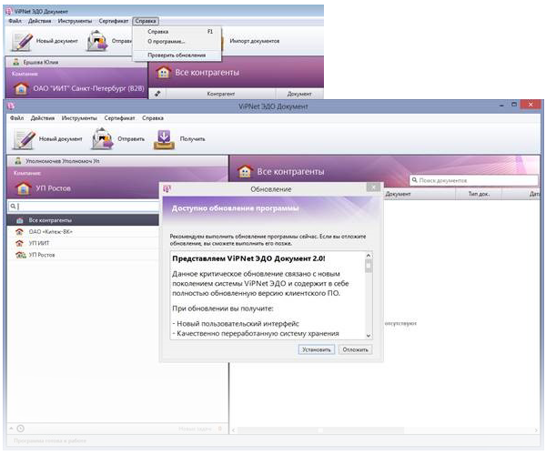 При входе в программу, либо по нажатию кнопки «Проверить обновление» в меню «Справка», появится окно с сообщением о доступном обновлении программы. Нажмите кнопку «Установить» для перехода на ViPNet ЭДО Документ 2.0.