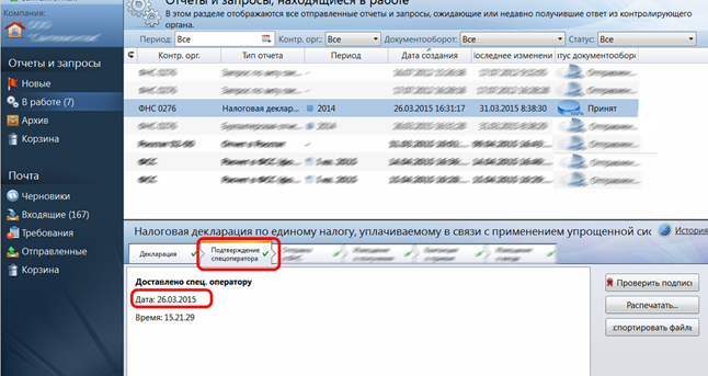 Согласно пункту 2.11 методических рекомендаций по организации электронного документооборота при представлении налоговых деклараций (расчетов) в электронной форме по телекоммуникационным каналам связи утвержденных действующим приказом ФНС России от 31.07.2014 N MMB-7-6/398@: "При регистрации дата представления налоговой декларации (расчета) соответствует дате, зафиксированной в подтверждении даты отправки, а дата поступления соответствует дате поступления в приемный комплекс налогового органа по месту представления". То есть, согласно данному пункту - НО в любом случае обязан будет принять для обработки Вашу отчётность той датой, которая стоит в документе «подтверждение даты отправки» в программе ViPNet ЭДО Отчет. Этот документ обозначается вкладкой «Подтверждение спецоператора» (см. рисунок).
